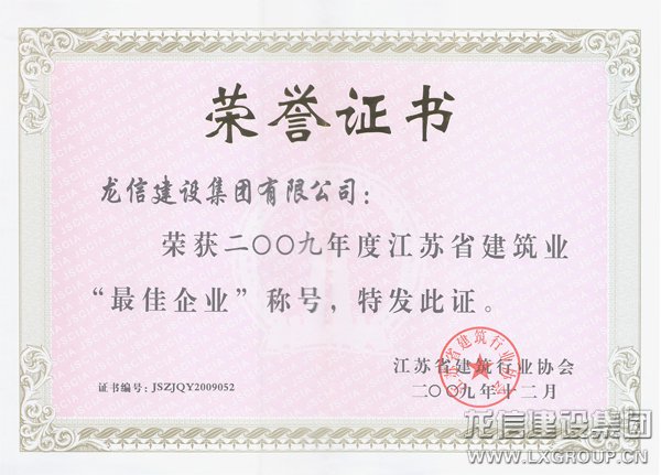 2009年度江苏省最佳企业证书
